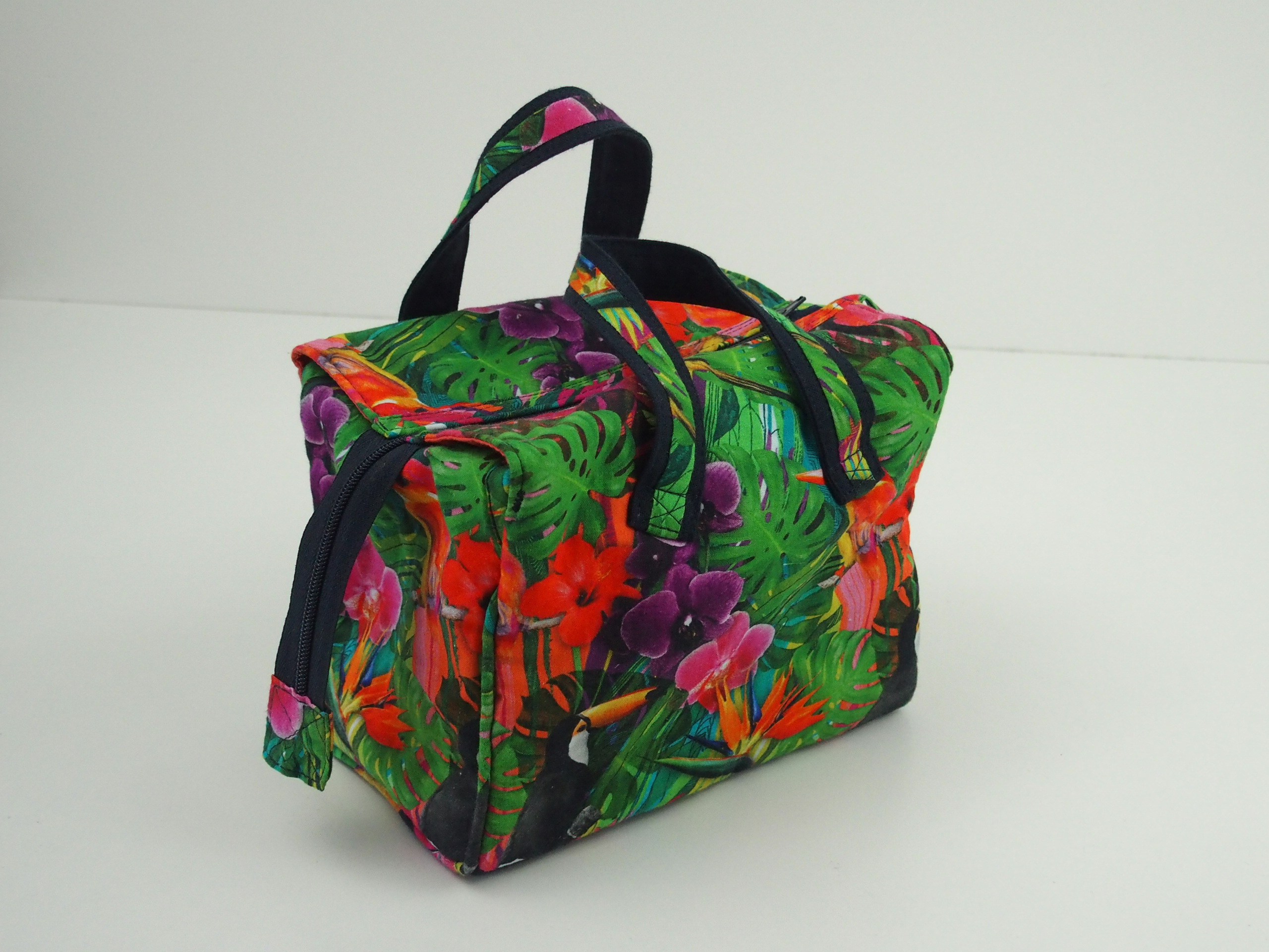 Trousse de toilette « Vacances » en tissu coton imprimé forêt d’Amazonie, des oiseaux et fleurs aux couleurs vives, une belle diversité de feuillages !