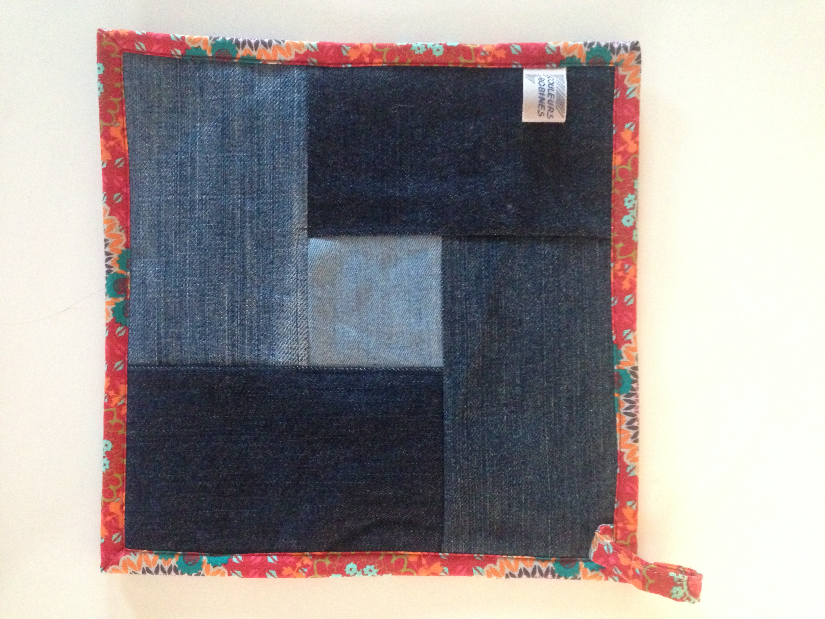 Voici deux paires de maniques, réalisées avec des chutes de tissu Jean’s de récup’