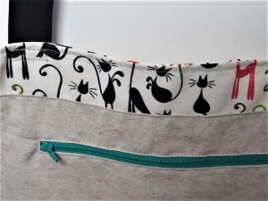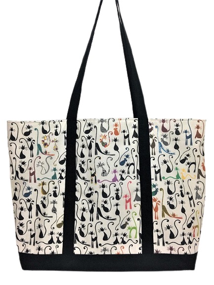 Tissu extérieur : toile enduite, imprimé chats, Fond et anses noires.