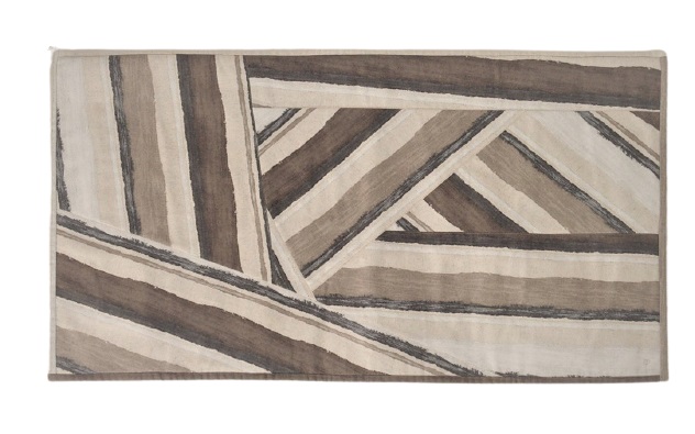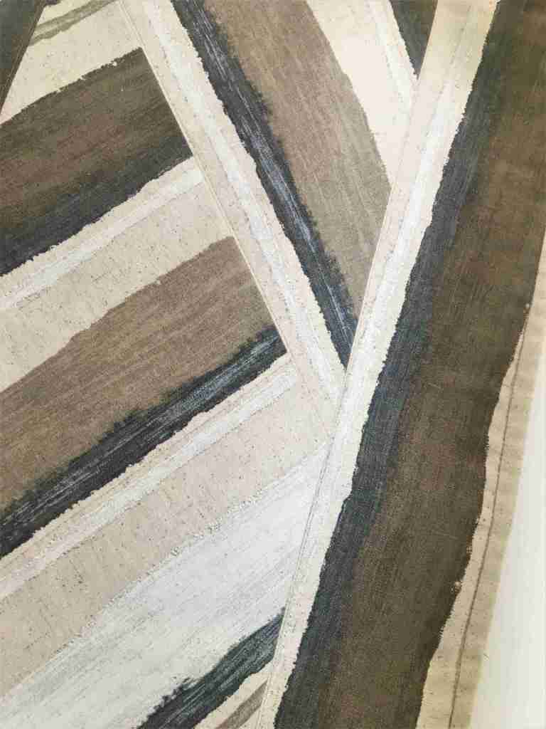 La toile utilisée est un imprimé aux grands tracés de pinceau dans un camaïeu de couleurs beige, gris et taupe.
