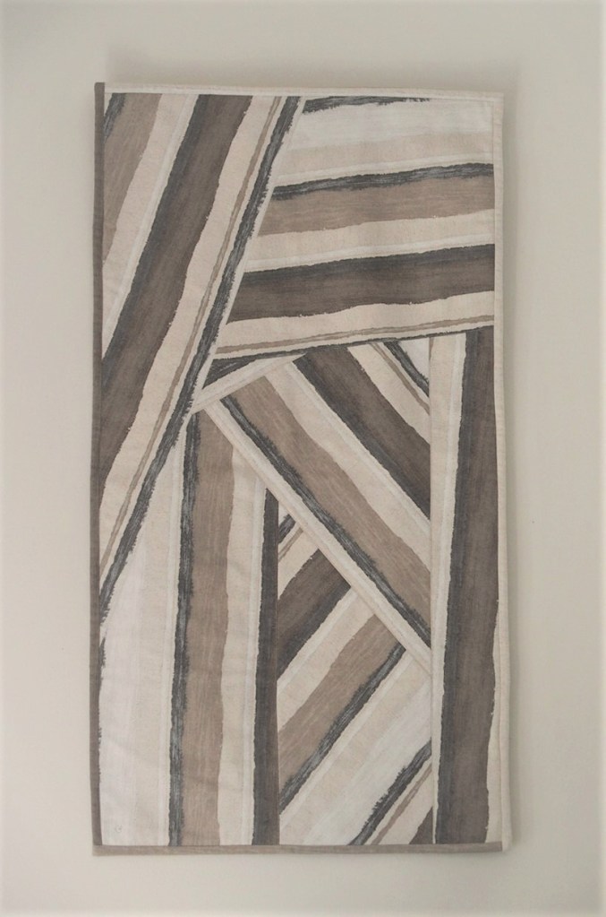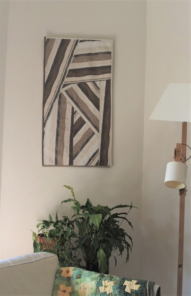 Un tableau en tissu aux teintes sobres à exposer sur un mur.