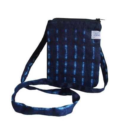 Pochette « Voyage » bleu marine, en tissu wax, entièrement doublée de tissu en coton.