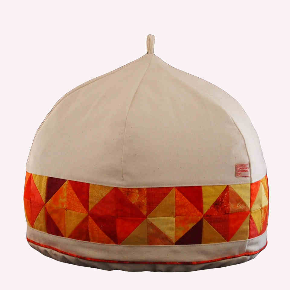 La bande décorative est réalisée en multiples petits triangles de tissus patchwork