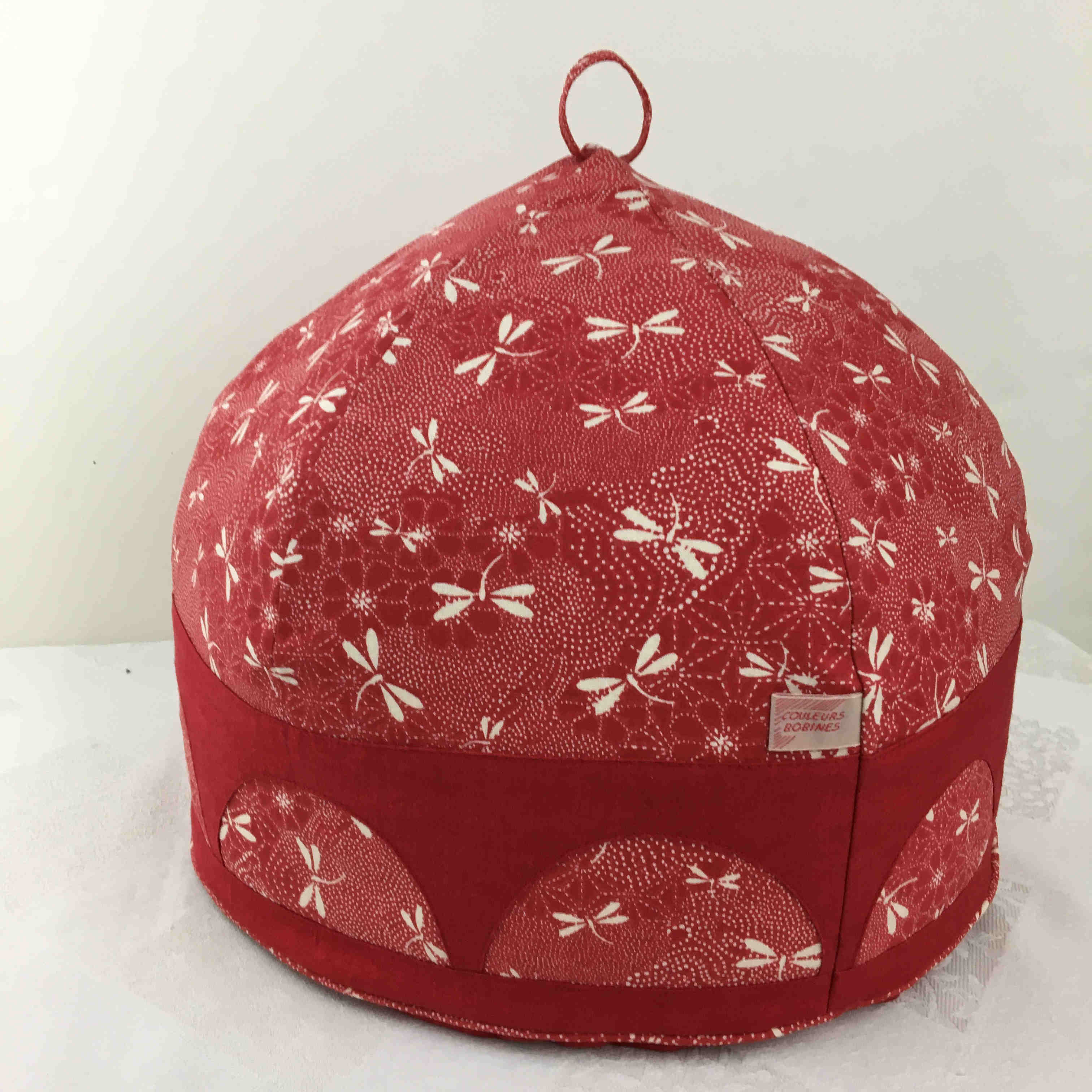 Housse décorative, patchwork en appliqué inversé sur popeline coton rouge imprimé libellules. Elle est déhoussable et lavable